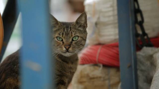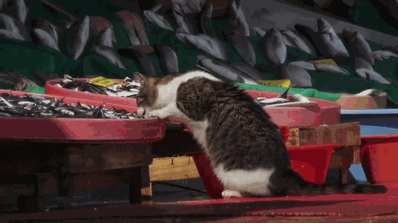 有些猫咪游荡在生鲜市场,穿梭于肉店和鱼铺,据称这只斑纹猫是出了名的偷鱼大盗!